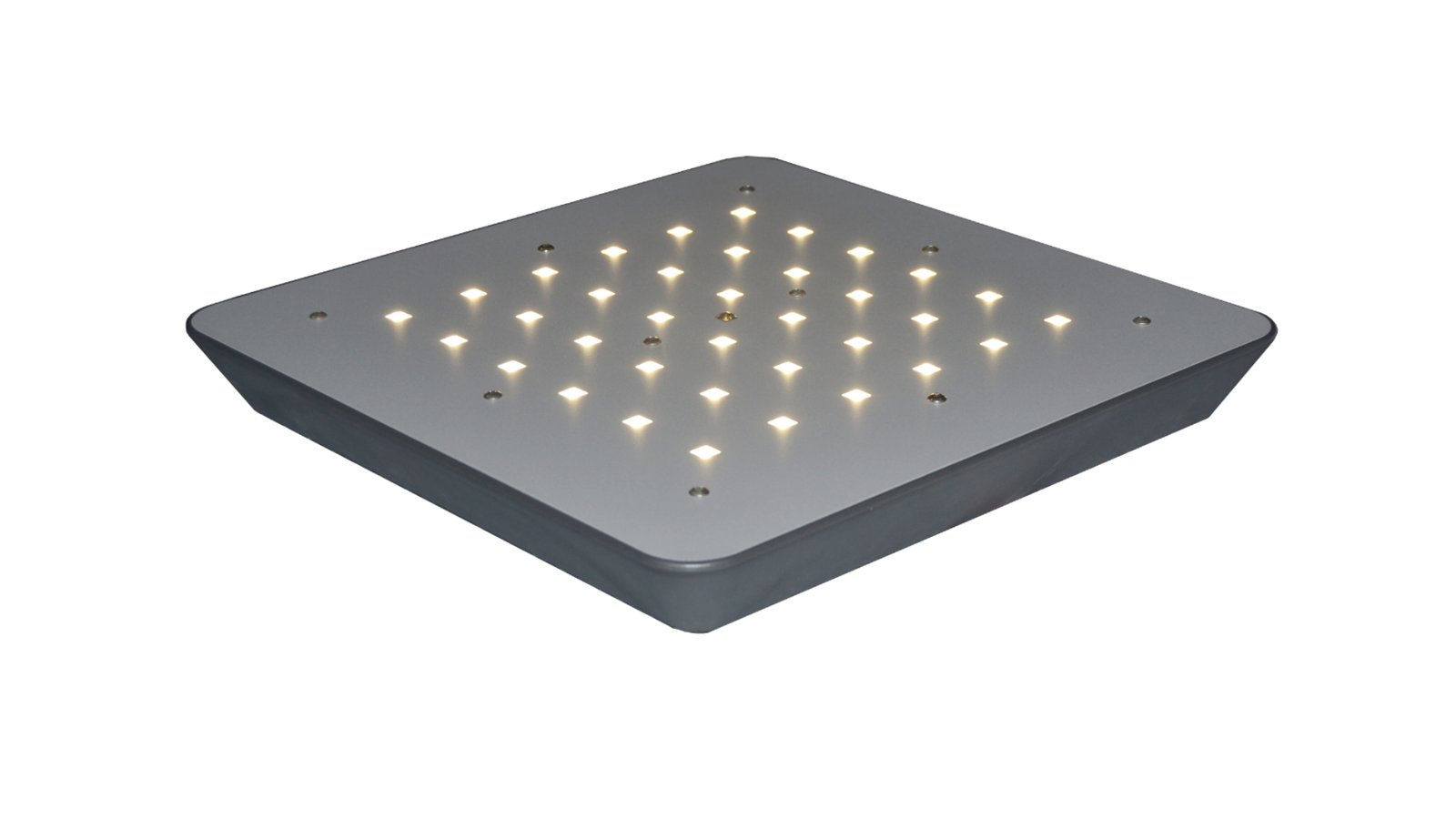 Plafoniera industriale a plafone, 40×40 cm, dotata di 36 ottiche in silicone, LED ad altissima luminosità, perfetta in ambienti industriali medi, laboratori, installata anche in aderenza al soffitto.